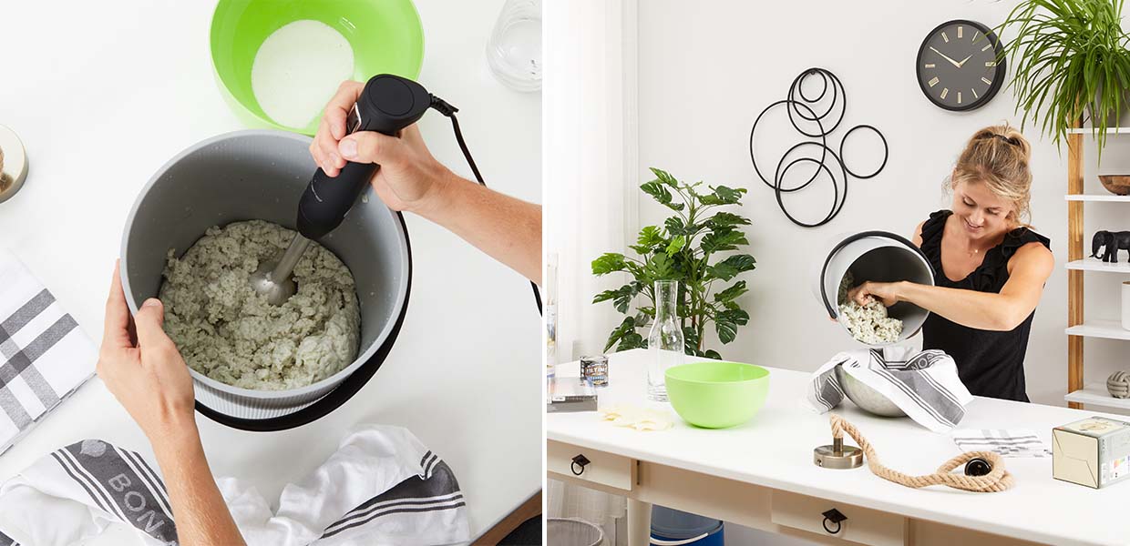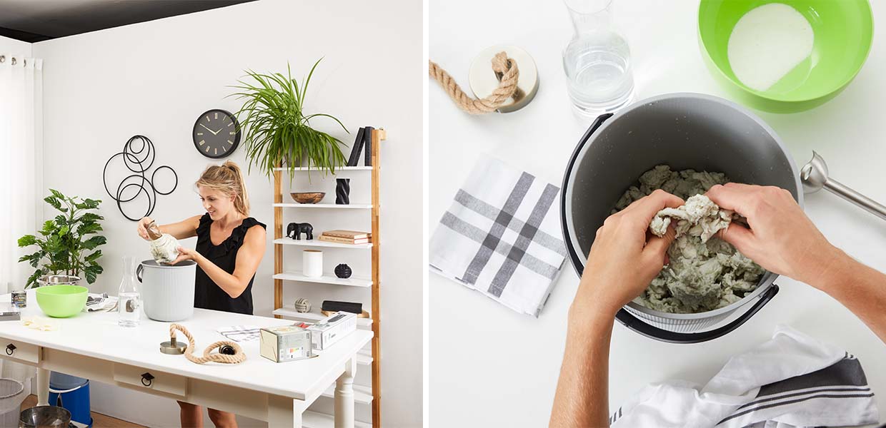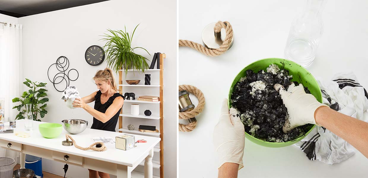 Отцедената смес изсипете в купа и енергично разбъркайте, като добавите лепилото за тапети (около 60 гр.) и акрилната боя в избрания цвят (нашият е сив – тип бетон, защото е суупер актуален). Сетихте ли се да сложите ръкавиците? J