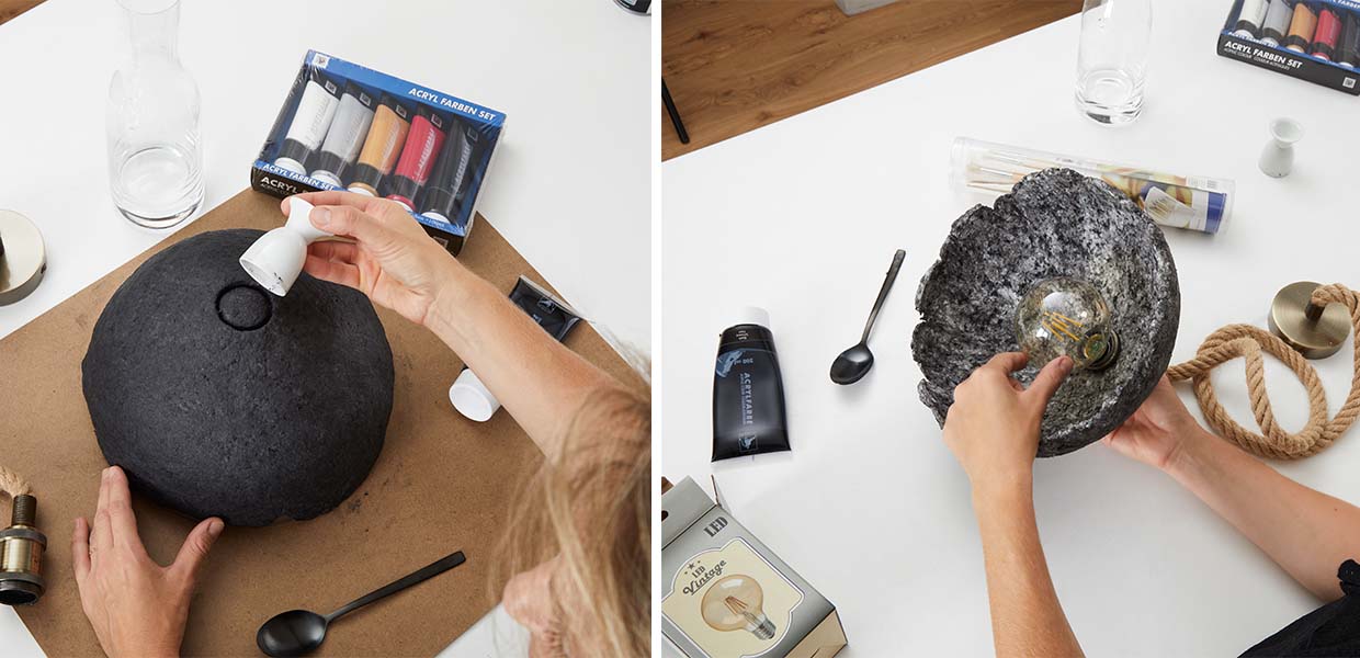 Когато се уверите, че вашият абажур е изсъхнал и е готов за самостоятелно съществуване, отделете го внимателно от купата и го боядисайте в стила на интериора (само по желание, защото той и така си е доста впечатляващ – нашият го оставихме натурален).
