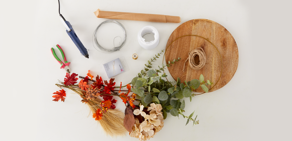 За есенния венец сме взели различни клонки и цветя в оранжево-кафеникави багри. Ние избрахме евкалипт, хортензия, пампарска трева, дъб и други. А освен цветята, за венеца ще е необходима хартия за печене и мека тел.