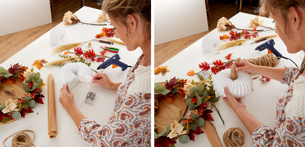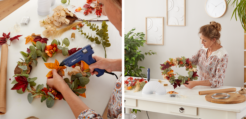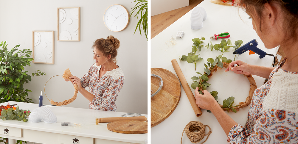 Първо започваме с увиването на телта в кръг, създавайки формата на венеца. Тук ще ни помогнат клещите, с които по-лесно ще боравим с телта. Когато основата на венеца е готова, започваме грубо да увиваме хартията за печене около него. Целта ни е да скрием телта и да придадем по-мек вид на венеца. Докато увиваме хартията, я залепяме със силикон, за да стои на мястото си. А когато сме готови и с тази стъпка, е време за най-забавната част – подреждането на цветята и растенията около венеца и прикрепянето им с малки части от телта.