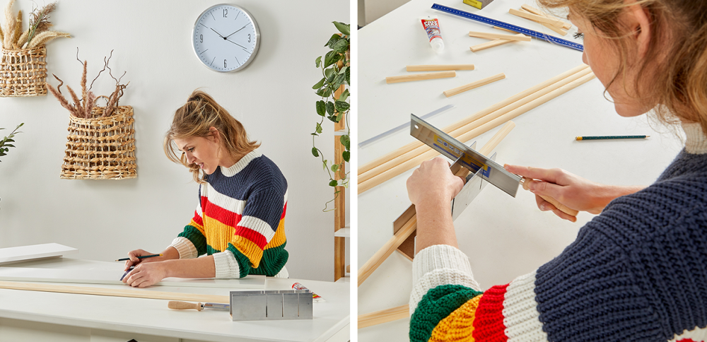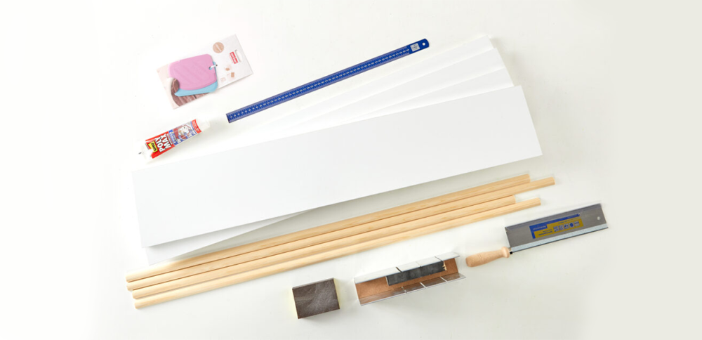 Започваме с полукръглите летвички. Първо те трябва да бъдат отрязани на подходящата дължина. За целта измери височината на чекмеджетата и отрежи летвичките спрямо тях.