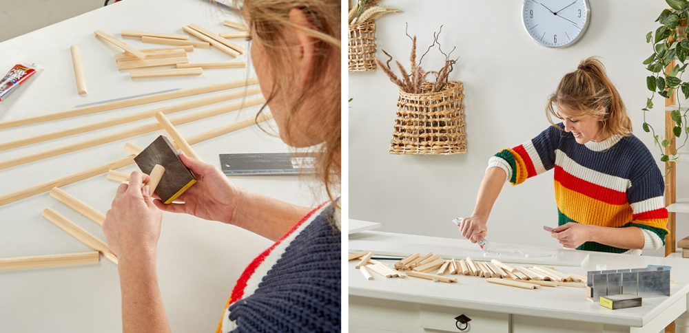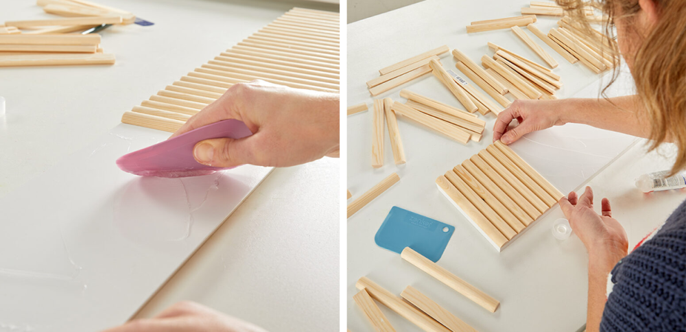 След като изпълниш тези две дълги стъпки, си почти готов. Сега остава само да нанесеш лепилото върху чекмеджето или фронта. Най-добре е да го нанесеш обилно с шпатула, след което да поставиш полукръглите пръчици една по една и да ги притиснеш здраво на мястото им.