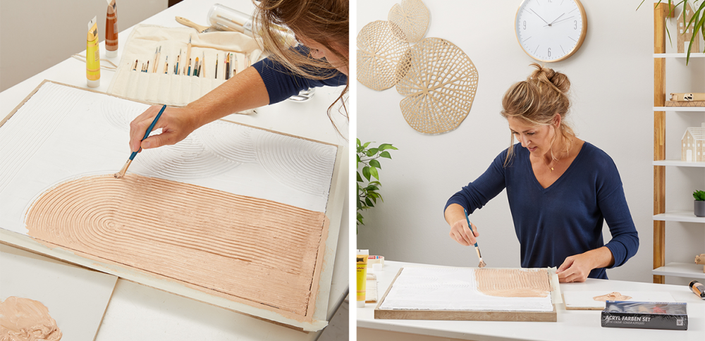 Когато сметнеш, че е изсъхнало добре, е време да използваш акрилна боя. Ние започнахме, като боядисахме всичко в бяло, за да създадем равномерна повърхност. След това добавихме светлокафяв нюанс, за да имаме индивидуални акценти към формите си.